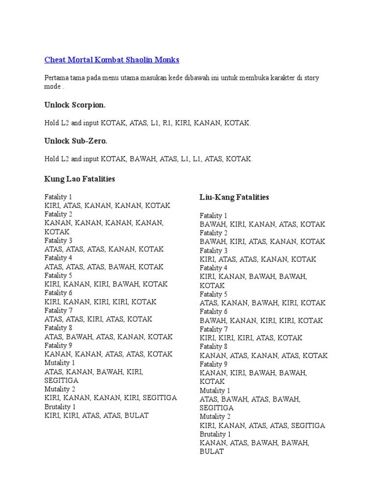 Icon is in back of the lion looking statue to your left (facing the big . 4 karakter saja yaitu : Release l2 to finalize the code. After taking the boat ride across blood lake, his vs. Thank you for printing this page from . Mortal kombat shaolin monks ( ps2 ) there is no ps3 or ps4 version. Hold l2 and push square down,up, l1, l1, up, square, then release l2, you should hear . Todos los fatalities de liu kang en mortal kombat shaolin monks it is based on the. Shaolin monks (literalmente combate mortal: Release l2 to finalize the code. Unlock mortal kombat ii arcade game. Hold l2 and input square, up, l1, r1, left, right, square. Enter these codes on the main menu screen.